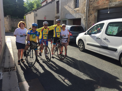 Dimanche 21 Mai : étape 2 – HURIEL (03) – SAINT AGNAN (71) Après une nuit réparatrice mais un peu hachée, 7h15 debout les bleus, non les jaunes on les voit mieux sur les routes. Et à 7h45 nous voilà attablés devant le petit déjeuner de la chambre d’hôtes, magnifaïque comme dirait l’autre. Nous nous attardons un peu et à 9h départ par les petites routes Bourbonnaises réservées ou presque aux vélos. Nos deux accompagnatrices nous orientent aux carrefours et c’est ainsi qu’au coin de notre chemin, voulant garer la voiture sur un bas côté bien tondu, Nadine n’a pas vu le trou. Le berlingo se retrouve posé en douceur avec 2 roues dans le vide. Nous sommes au Haut Bocage, commune de Givarlais, il est 10 h. Heureusement un conseiller municipal agriculteur et plusieurs de ses administrés nous aident et c’est ainsi que sans bobo se termine la deuxième mésaventure de notre voyage. Nous repartons donc jusqu’à Cosne d’Allier avec un petit retard que nos cyclistes ne tardent pas à combler avec une moyenne de 24 km/h. La route traverse ensuite une belle forêt jusqu’à Souvigny. 12h30 après 77 km : Coulandon et son auberge Saint Martin. Nous attachons les vélos pour la première fois sur le porte vélo, ce n’est pas une mince affaire, mais maintenant nous savons comment faire. Deux quidam nous abordent, ils sont peut-être de la MGEN, pas sûr du tout, mais c’est certain ils sont connus du bar et surtout très consommateurs… Pour le repas il faut noter le petit gratin d’écrevisses, bien sûr les pates bien assaisonnées et la panacotta, encore une très bonne adresse. Nous repartons à 14h30 et après avoir traversé Moulin en voiture, nos cyclistes remontent en selle 1/2h plus tard, avant Montbeugny. Les km s’écoulent tranquillement, Thiel sur Acolin, Dompierre sur Bresbre, Diou où nous traversons la Loire et rencontrons le cyclo 51. Nous suivons la Loire sur quelques km puis tournons à gauche, nous attaquons la dernière montée : dure dure dure ! Mais en haut quelle récompense ! L’horizon est magnifique et la Loire s’écoule tranquille. Nous allons vite oublier les 42 km sous le soleil et par 23°. Attablés dans le jardin nous dégustons une, puis deux puis trois tartines de houblon chez nos amis Cécile et Simon. Ce soir Cécile travaille, nous attendrons son retour pour boire la tisane. Bilan de la journée : 119 km en 5h, soit comme hier 24 km/h.