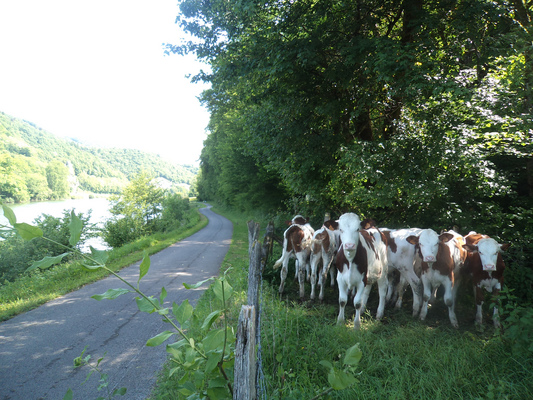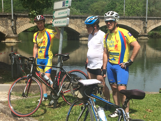 Nous sommes passés à la pharmacie pour calmer les petites douleurs causées par la gentiane de la veille….Puis nous nous sommes postées sur la « vélo route » au bord du Doubs ; un peu d'attente et voilà nos gaillard dans notre dos, « c'est mal indiqué nous nous sommes perdus, grande route, voiture, camion ».