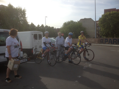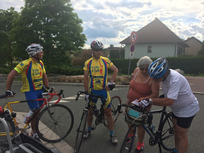 Bon, direction notre table et de nouveaux, après 97 km de petites galères, mais en étant contents du spectacle, des paysages , nos champions nous rejoignent. Repas en terrasse, encore un repas agréable. Vers 16 heures après une petite demi-heure de voiture, nous voilà à Brognard ou sûrs de nous, nous avions la bonne piste, itinéraire repéré kilomètres comptés, seul bémol, Jean-Louis disais c'est sans les allers-retours. Ils partent, nous aussi, bien décidées à baliser le parcours.