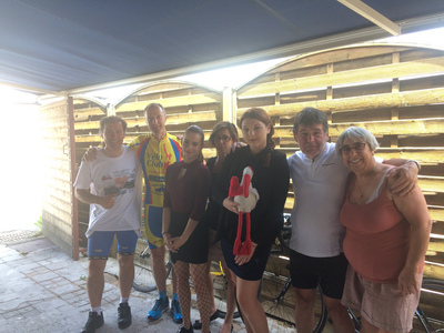 Bonsoir il est 20h45 et c'est devant un apéritif au vin du Jura que nous vous écrivons installés sur la terrasse d'un chalet confortable dans un camping agréable que nous avons déjà décidé de réserver pour enfin grimper le ballon d'Alsace ; il faudra d'ailleurs réserver les cinq bungalows car nous serons nombreux à encadrer nos trois cyclistes.