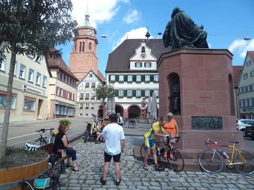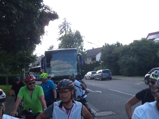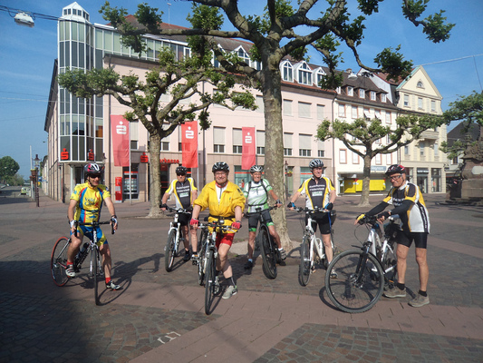 ETAPE 6 : Jeudi 25 Mai Seebach – Filderstadt Après cet accueil très amical nous avons rejoint nos chambres respectives et à nouveau nous nous sommes crus en chambre d´hôte. Denis a eu la surprise d´apprendre que Raymond achetait son pain dans la même boulangerie que lui. Puis nous avons degusté ensemble un vrai repas alsacien avec un excellent plat de charcuterie que Paule n´a fait que regarder, mais elle s`est rattrapée sur les crudités. Boulettes de viande en sauce et pates (specialité alsacienne), fromages locaux, tarte à la rhubarbe servie sans boule de glace pour le plus grand plaisir de Philippe. Comme nous n´avons pas téléphoné pour réserver l´autoroute, nous avons mis un peu de temps pour traverser Strasbourg. Mais quelle idee ont tous ces gens de passer à Strasbourg à la même heure que nous ! Donc étant arrivés tard, la première idée de se coucher de bonne heure s´est transformé en coucher à une heure ! Cette soirée ayant été très réparatrice, c´est sans problème que ce matin nous démarrions à 8h15 de Seebar comme prévu. A 9h pile, nous pénétrons sur la Marktplatz entièrement déserte de Rastatt. Au milieu attendait Dieter et 4 autres cyclistes venus nous rejoindre pour cette dernière étape avec les pompiers. A 9h05, départ de la petite troupe que nous revoyons 30 km plus loin à Karlsruhe au bout d´1h30. Petite pause et les voila repartis pour 30 km jusqu´à Pfortzheim où nous prenons notre premier repas allemand offert gentillement par Dieter dans un ´´Biergarten´´. Exactement 1 heure après, nous reconnaissons bien là la rigueur d´Outre Rhin, nos champions repartent en direction de Weil Der Stadt, 25 km plus loin et dernière halte avant l´arrivée. Par contre les Mamarazzi étant partagées entre le GPS et les pancartes, font quelques allés et retours inutiles, bien obligés de le reconnaitre. Notre halte se fait sous la surveillance du mathématicien Képler, petit café pour les uns, glace pour les autres et le petit geste de Dieter a signalé le moment du départ. Nous avons récupéré 8 autres cyclistes, au moment où la roue d’un des nôtres a fait « pfitt » une troisième fois. Beaucoup de sauveteurs autour pour effectuer une grèfe rapide du boyau. Nous ne les reverrons qu’à Filderstadt. Il nous faut vite organiser la jonction avec les cars à « Der Weg der Herinnehrung ». Petit coup de téléphone avec Serge et tout est au point. A 18h nous devrions former le cortège. C’est dans ce dernier tronçon que nous avons compris que depuis que nous sommes entrés en Allemagne, notre GPS ne sachant pas lire le « ß », nous avons roulé sur des « strabéta », par exemple « Hauptstraße » sést transformé en « Optstrabéta » ! Qu’est-ce qu’on a ri ! Après une petite heure d’attente, nous avons réussi l’exploit de réunir la route et la piste cyclable. Il était 18h08. Nous avons atteint la philharmonie en cortège, en musique grâce à « Al Denté » et accueillis par nos amis de Filderstadt. C’était la fin de notre raid pour Elsa. Nous étions heureux et pourtant nous avons eu un pincement au coeur de voir notre aventure se terminer. Mais nous savons bien que l’histoire n’est pas finie Bilan de la journée : 129 km en 6h10 de pédalage. Nos cyclistes encadrés par nos amis allemands ont trouvé que cette dernière étape était une promenade de santé. Ils étaient sûrs de ne pas se perdre ! Et nous on était sûr de les retrouver aux différents points de rencontre très bien balisés par Dieter. Bilan de notre aventure : nous avons accompagné 3 jeunes hommes très indisciplinés. Nous sommes convaincus que la solidarité existe et qu’Elsa pourra un jour lire l’histoire de ce voyage.